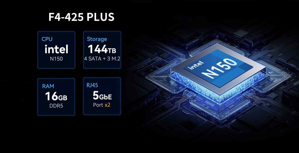The F4-425 Plus and F2-425 Plus are powered by Intel N150 quad-core processor (up to 3.6 GHz), 16GB/8GB DDR5 memory, and dual 5GbE network interfaces, achieving transfer speeds of up to 1010 MB/s to handle high-demand data processing with ease.